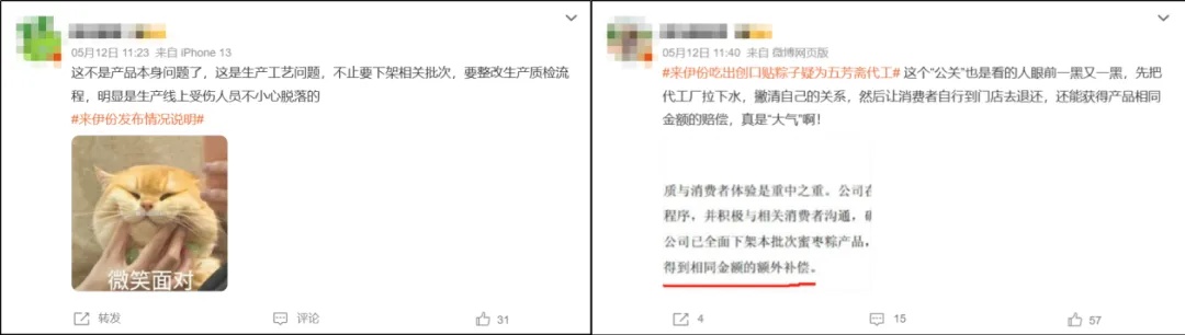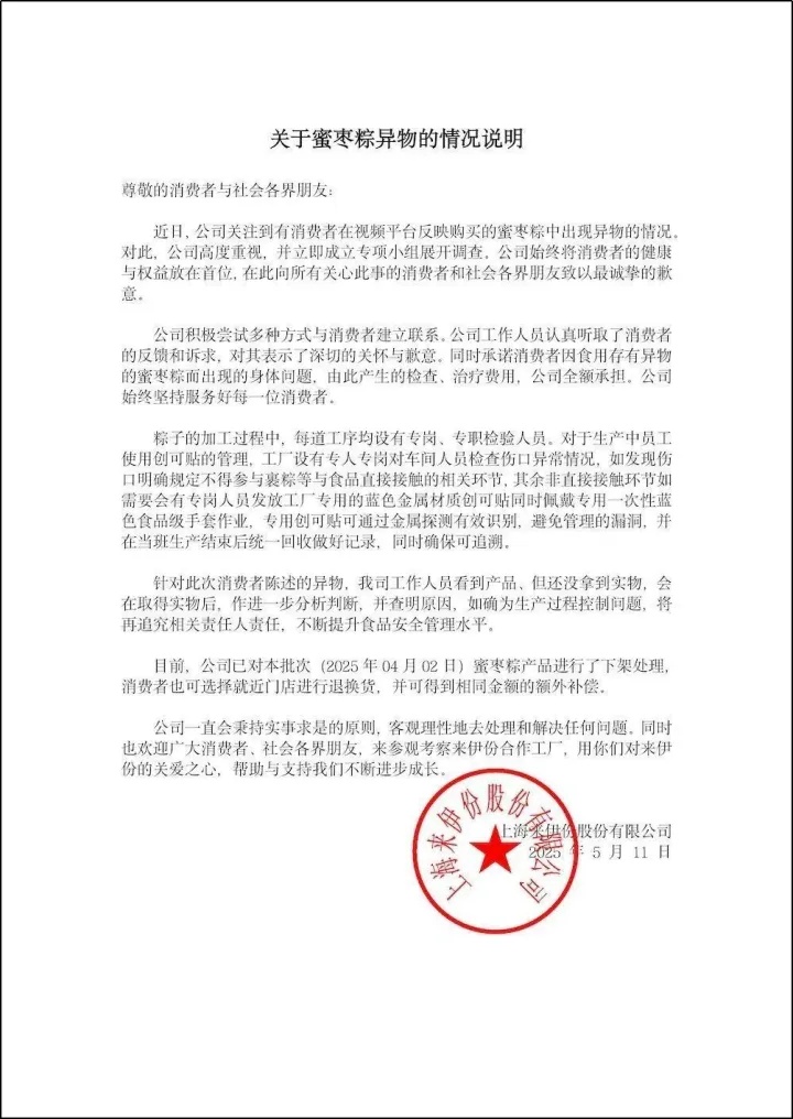 5月12日凌晨,来伊份就在官网发布了公告对事件进行说明,称已对涉事批次蜜枣粽下架处理,消费者可就近门店退换货,并获相同金额额外补偿。公司成立专项小组调查,承诺承担消费者因食用问题粽子出现身体问题的检查、治疗费用。