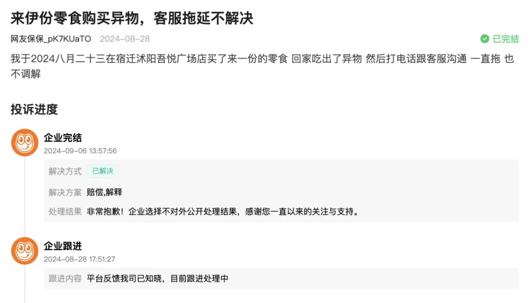 同月,一位消费者在消费保平台投诉称8月23日在来伊份宿迁沭阳吾悦广场店买了一份零食,回家吃出了异物,客服不调解最终导致他发起投诉。9月6日,来伊份申请完结了这次投诉,解决方案是赔偿、解释。具体处理结果企业选择不对外公开。