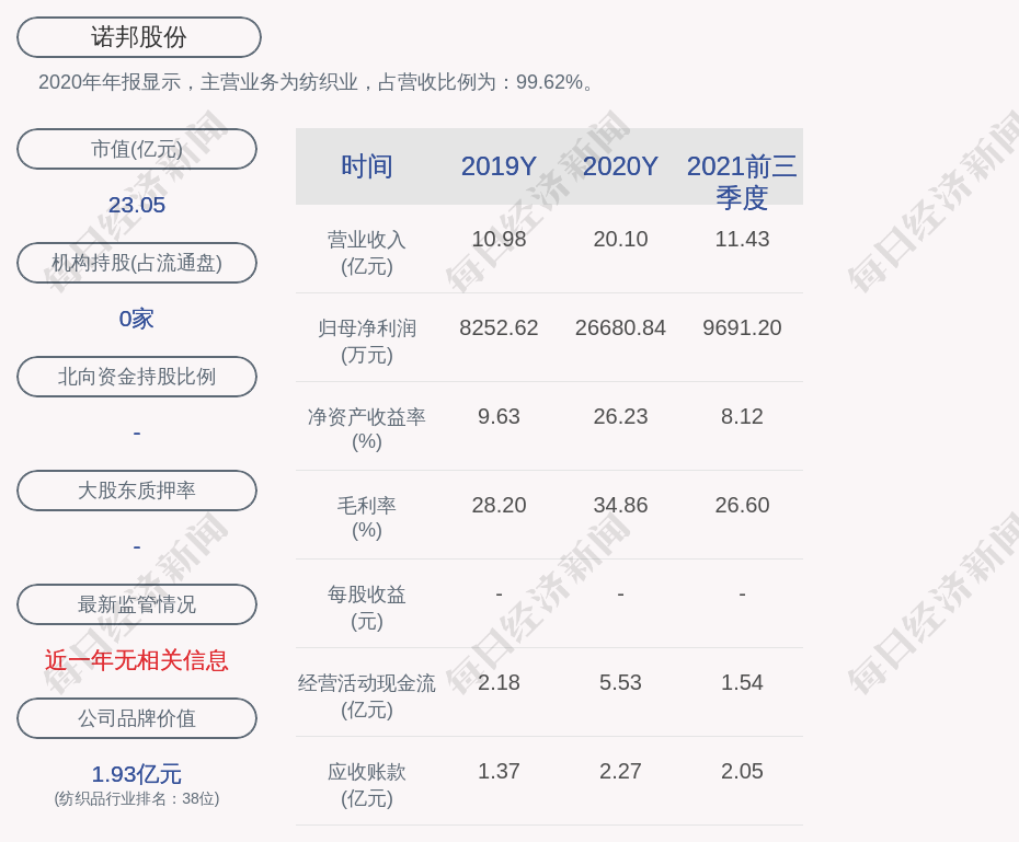 2020年年报显示,诺邦股份的主营业务为纺织业,占营收比例为:99.62%。