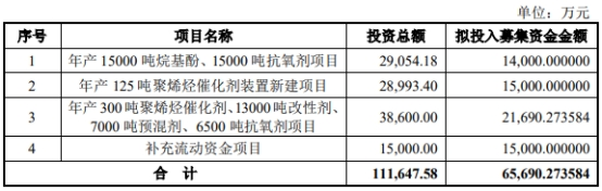 鼎际得首次发行募集资金总额为73,006.27万元,募集资金净额为65,690.27万元。鼎际得2022年7月18日披露的招股书显示,公司募集资金计划用于“年产15000吨烷基酚、15000吨抗氧剂项目”、“年产125吨聚烯烃催化剂装置新建项目”、“年产300吨聚烯烃催化剂、13000吨改性剂、7000吨预混剂、6500吨抗氧剂项目”、“补充流动资金项目”。