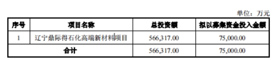本次发行的募集资金总额不超过人民币75,000.00万元(含本数),扣除发行费用后将用于辽宁鼎际得石化高端新材料项目。