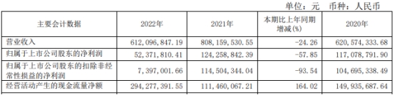 2022年,宏和科技实现营业收入6.12亿元,同比下降24.26%;归属于上市公司股东的净利润5237.18万元,同比下降57.85%;归属于上市公司股东的扣除非经常性损益的净利润739.70万元,同比下降93.54%;经营活动产生的现金流量净额为2.94亿元,同比增长164.02%。
