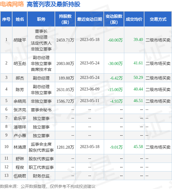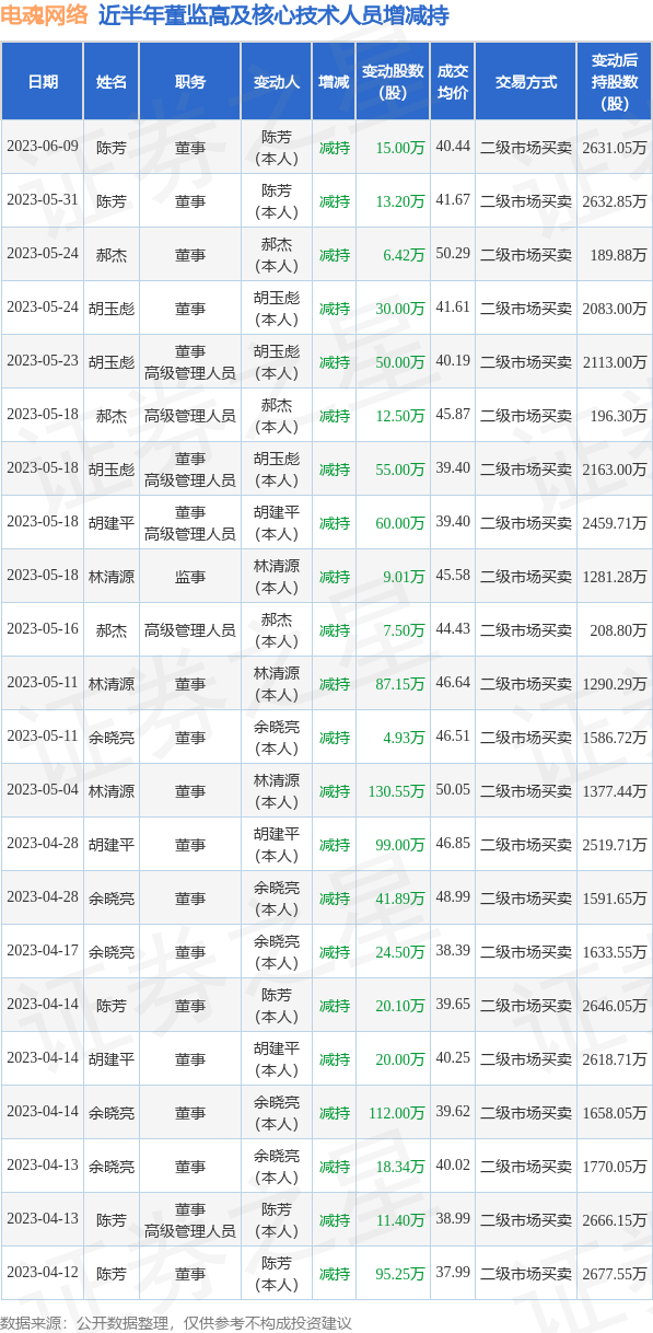 电魂网络近半年内的董监高及核心技术人员增减持详情如下: