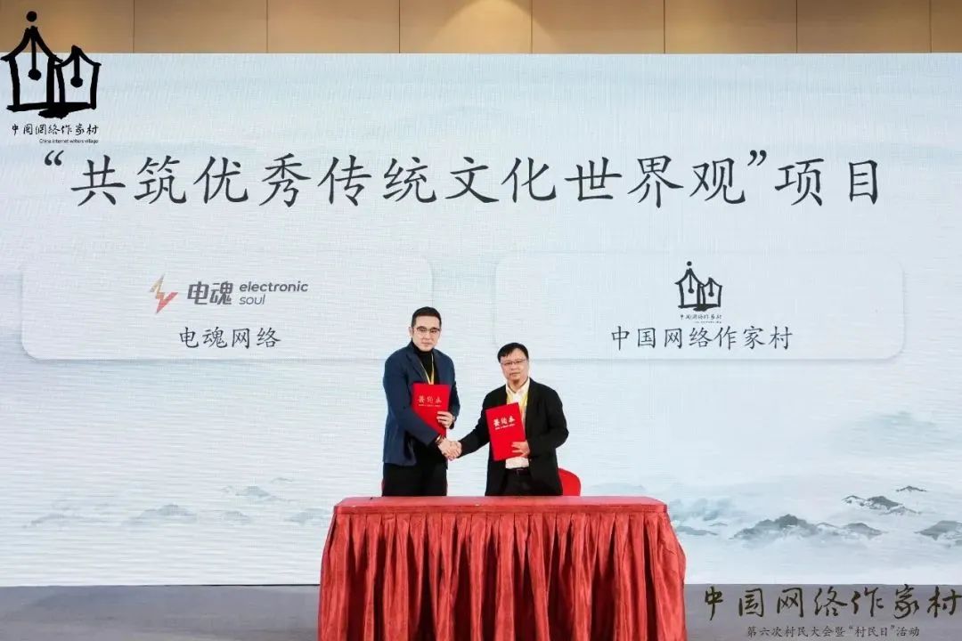 在中国网络作家村六周年“村民日”活动中,电魂网络和中国网络作家村进行了“共筑优秀传统文化世界观”项目战略合作签约仪式,旨在响应杭州市政府区域产业交流的政策,弘扬中华传统文化,促进网络文学与网络游戏产业的繁荣发展。