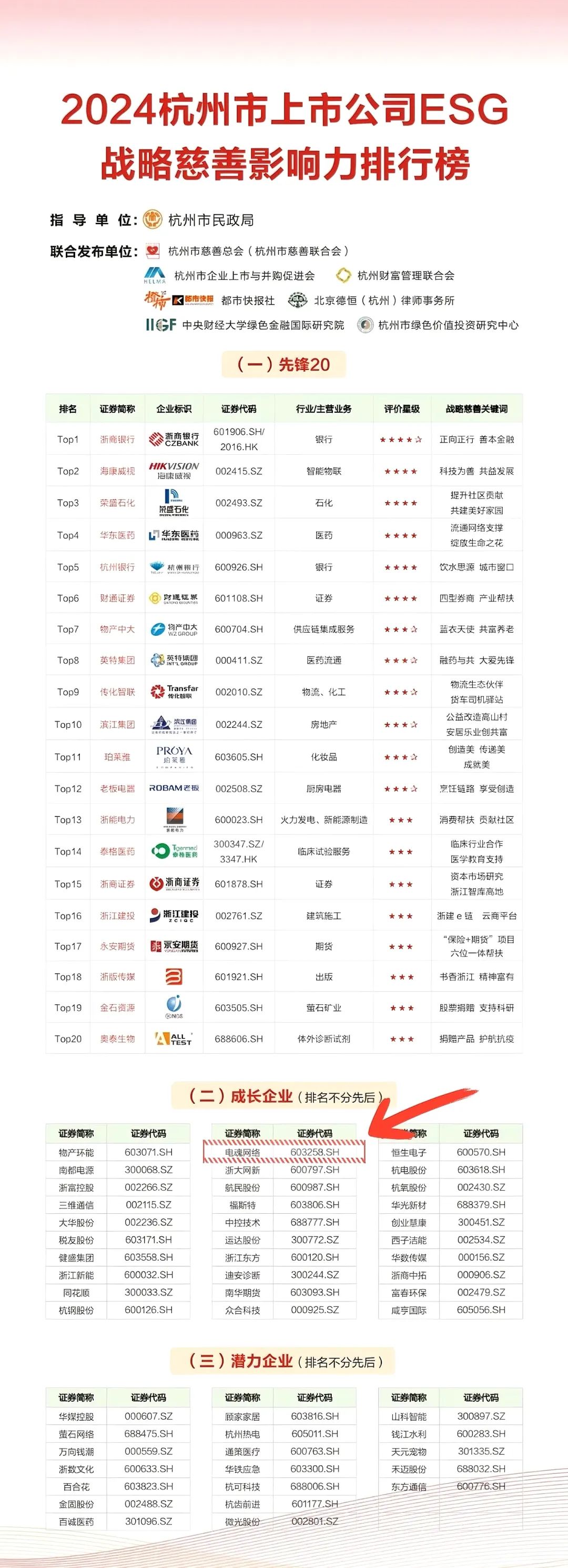 9月5日,由杭州市民政局、杭州市慈善总会(杭州市慈善联合会)、余杭区委区政府主办的2024杭州市“钱塘善潮”嘉年华活动正式启动。会上,由杭州市慈善总会(杭州市慈善联合会)、杭州市企业上市与并购促进会、杭州财富管理联合会、都市快报社、北京德恒(杭州)律师事务所、中央财经大学绿色金融国际研究院以及杭州市绿色价值投资研究中心,共同发布《2024杭州市上市公司ESG战略慈善影响力排行榜》和指数。