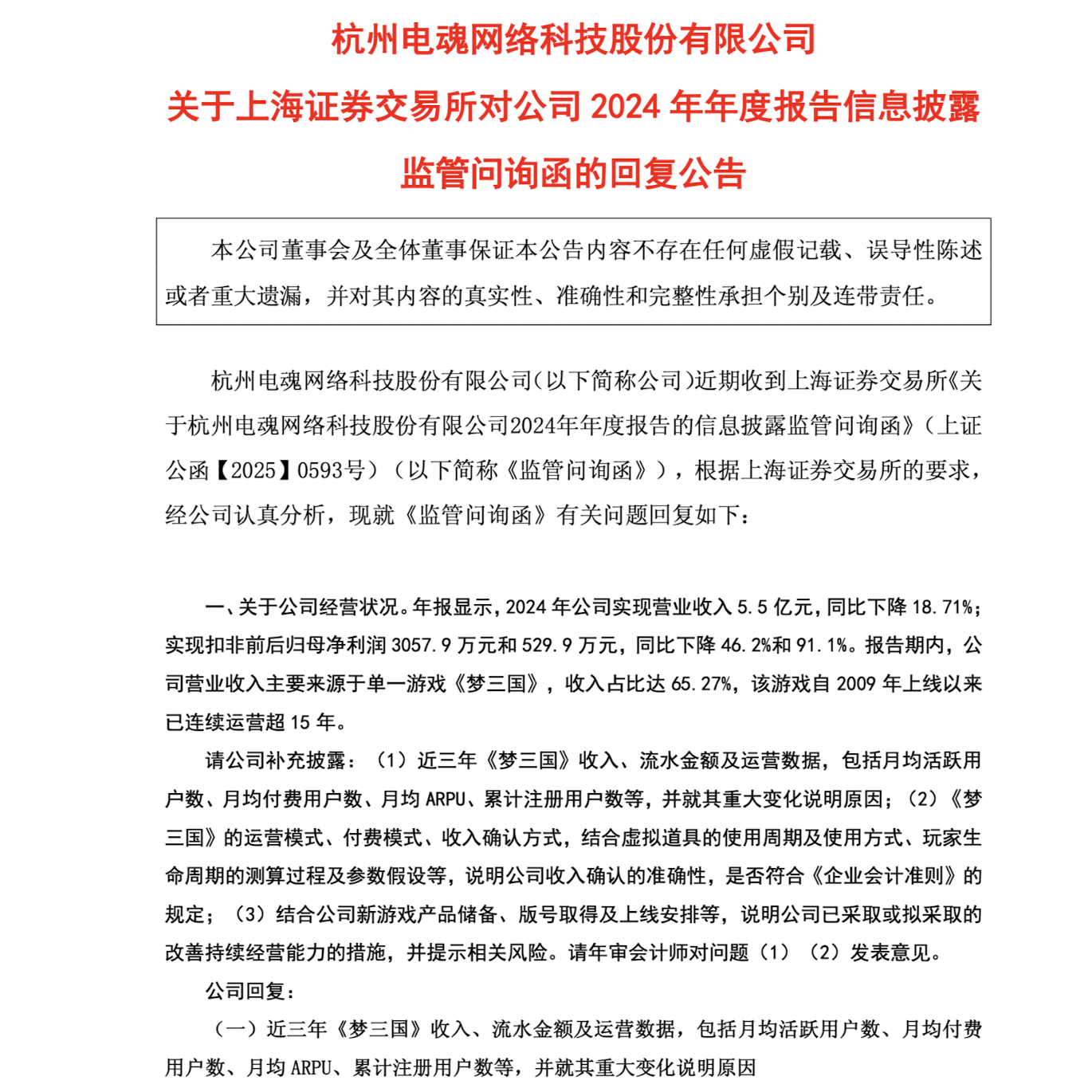 值得一提的是,电魂网络对《梦三国》端游的依赖还引来了上交所的关注。此前6月,上交所曾对电魂网络2024年年度报告信息披露发去问询函。