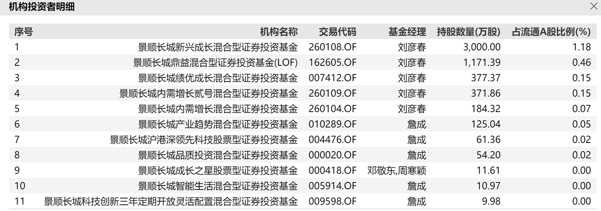 与此同时,持股数第二位是千亿基金经理刘彦春景顺长城新兴成长混合型证券投资基金持有3000万股;景顺长城鼎益混合型基金(LOF)持有1,171.39万股;景顺长城绩优成长混合型基金持有377.37万股;景顺长城内需增长贰号基金持有371.86万股;景顺长城内需增长混合型基金持有184.32万股;