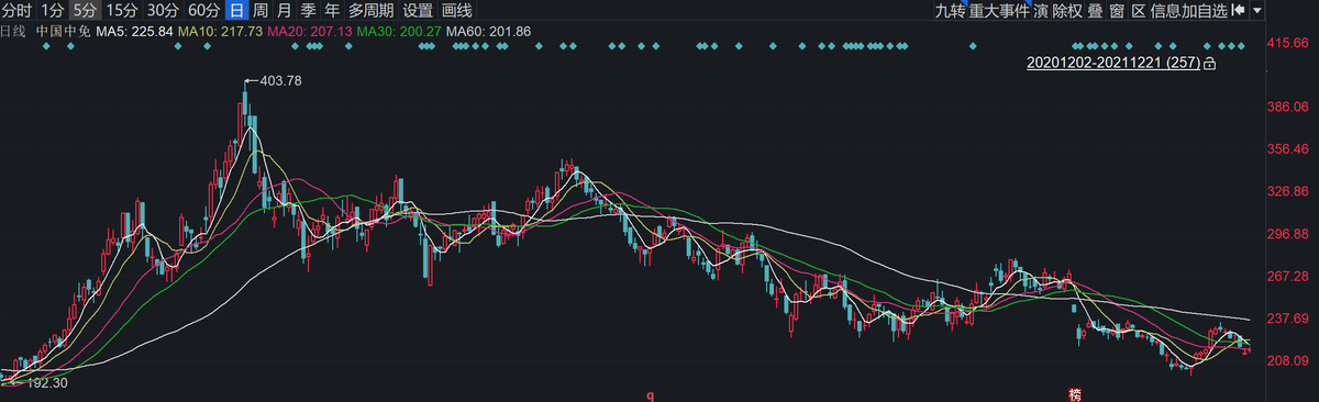 近期,奥密克戎毒株在全球肆虐,对全球免税生意造成巨大影响,中国中免股价也在近期出现加速下跌态势。