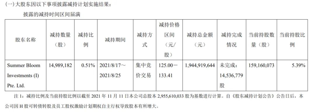 2021年11月13日药明康德公告,股东summer bloom investments在2021年8月17日-25日期间通过集合竞价减持1498.92万股,套现19.45亿。2021年10月9日公告,董监高人员Edward Hu(胡正国)、Steve QingYang(杨青)、Minzhang Chen(陈民章)、Shuhui Chen(陈曙辉)、Ellis Bih-HsinChu(朱璧辛)、姚驰,在2021年8月13日-9月30日期间累计减持30.68万股,套现4466万。