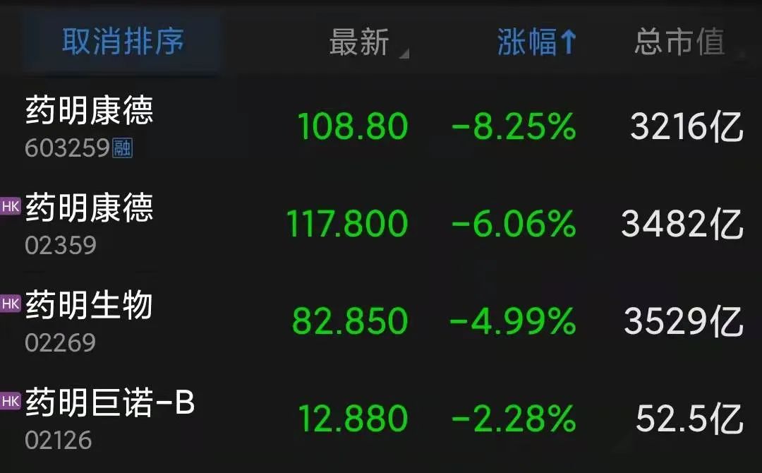 按市值算,A股药明康德蒸发1717.82亿人民币,港股药明康德蒸发2516.41亿港元,药明生物蒸发2755.19亿港元,药明巨诺蒸发153.01亿港元。
