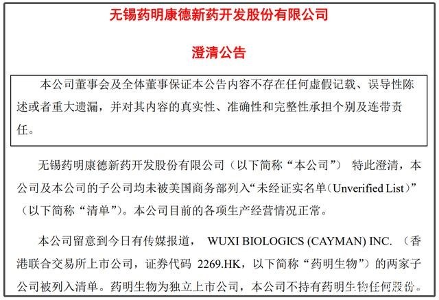事实上,在2月8日午间,药明康德发布了一则澄清公告称,公司及子公司均未被美国商务部列入“未经证实名单”;公司目前的各项生产经营情况正常,药明生物为独立上市公司,药明康德不持有药明生物任何股份。