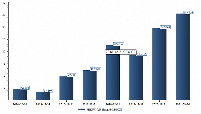 从过去看公司净利总体呈上涨态势,2019年、2020年归母净利为约18.5亿元、30亿元,业绩快报显示2021年全年归母净利超过了过去2年净利之和。