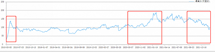 而后股价开始震荡回落,截至2022年2月11日股价跌至近最低点,达81元/股,距2021年股价最高点已跌去超5成。