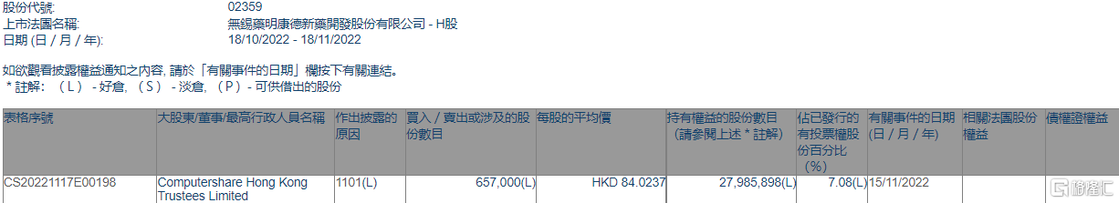 根据联交所最新权益披露资料显示,2022年11月15日,药明康德(02359.HK)获Computershare Hong Kong Trustees Limited在场内以每股均价84.0237港元增持65.7万股,涉资约5520.36万港元。