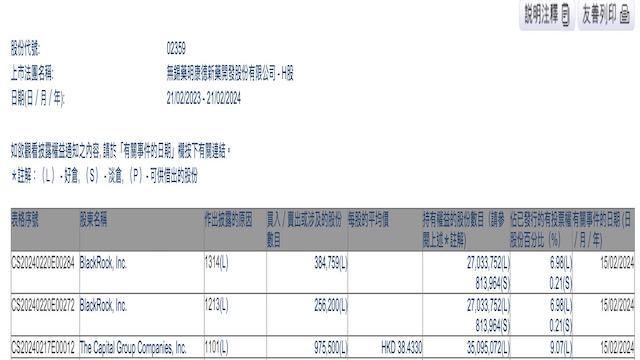 港交所显示,2023年,美国资本集团也多次增持过药明康德股票。