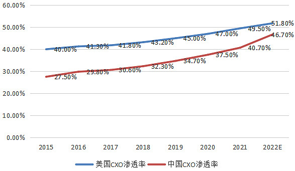 中美CXO渗透率都是逐年提升的,主要原因是药企在越来越高的研发成本下,想通过外包一部分研发来降本增效
