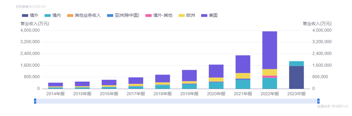据药明康德2023年三季报,公司来自美国客户收入194.0亿元,剔除特定商业化生产项目后同比增长36%;来自欧洲客户收入32.8亿元,同比增长10%;来自中国客户收入52.4亿元,同比增长5%;来自其他地区客户收入16.2 亿元,同比增10%。