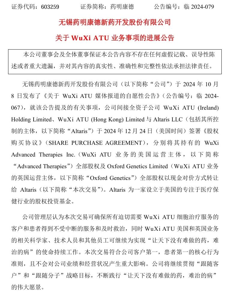 12月24日,药明康德宣布了一项重大业务调整,公司间接全资子公司WuXi ATU (Ireland)Holding Limited和WuXi ATU (Hong Kong) Limited与Altaris LLC(以下简称“Altaris”)签署了股权购买协议。