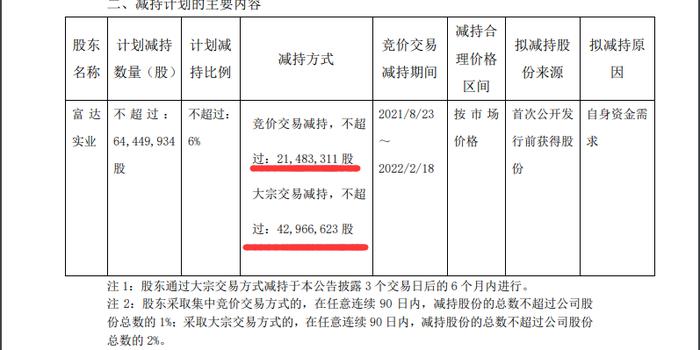 减持计划内容显示,股东富达实业拟自本减持计划公告披露日起15个交易日后的6个月内计划通过集中竞价交易方式减持不超过21,483,311股(即不超过公司总股本的2%);拟自本减持计划公告披露日起3个交易日后的6个月内计划通过大宗交易方式减持不超过42,966,623股(即不超过公司总股本的4%),按照今日收盘价估算,上述减持市值合计约67.45亿元。