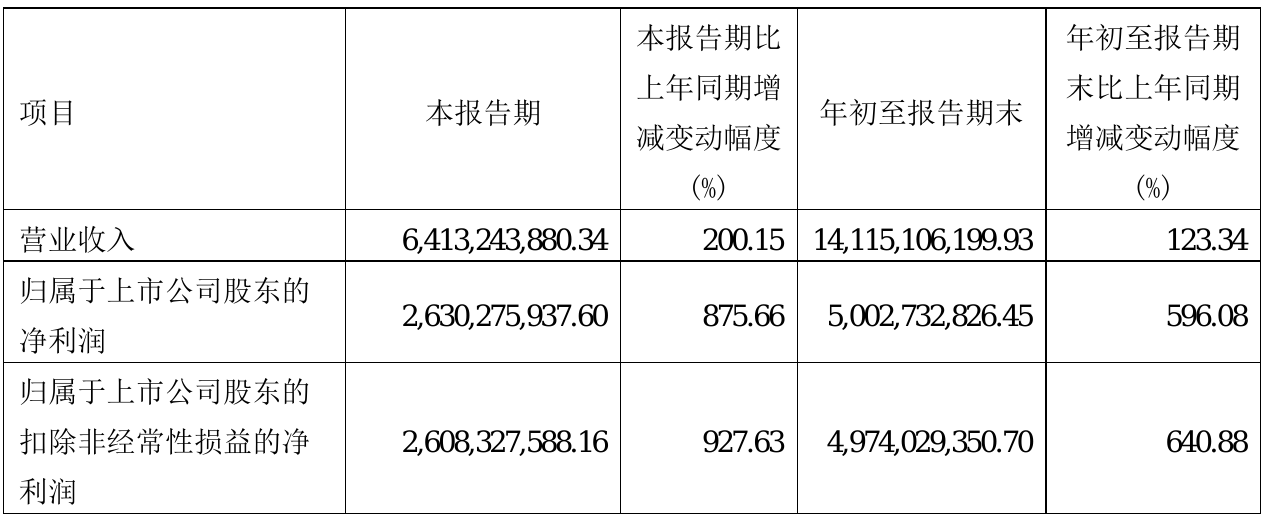 挖贝网10月26日,合盛硅业(603260)近日发布2021年前三季度报告,报告期内营业收入14,115,106,199.93元,同比增加123.34%;净利5,002,732,826.45元,同比净利增加596.08%。