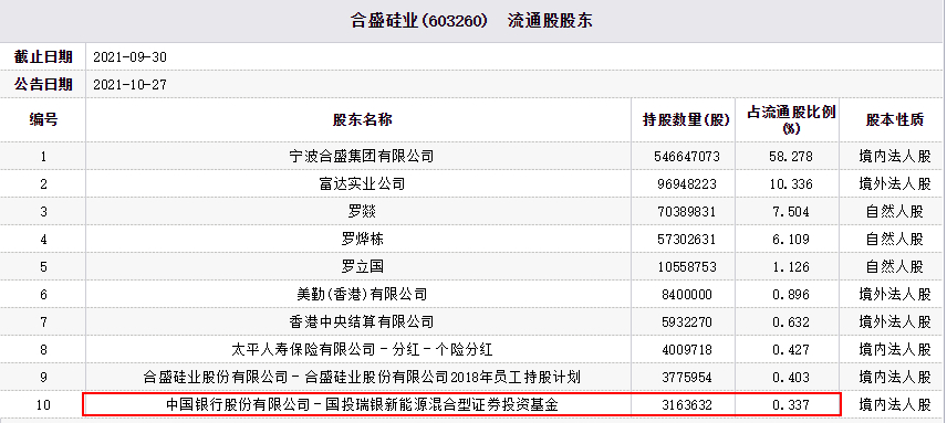 截至2021年9月30日,中国银行股份有限公司-国投瑞银新能源混合型证券投资基金持有合盛硅业316.36万股股份,占流通股比例0.337%,为其第十大流通股东。