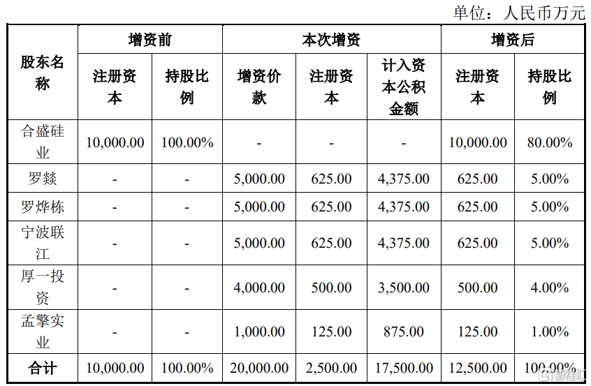 格隆汇12月15日丨合盛硅业(603260.SH)公布,为加快公司碳化硅业务的发展、扩大业务规模,确保满足子公司正常运作所需资金需求,公司全资子公司合盛新材拟进行增资,注册资本由1亿元增加至1.25亿元,新增注册资本由外部投资者宁波联江、厚一投资、孟擎实业以及公司关联方暨公司副董事长罗燚,公司董事、总经理罗烨栋认缴。