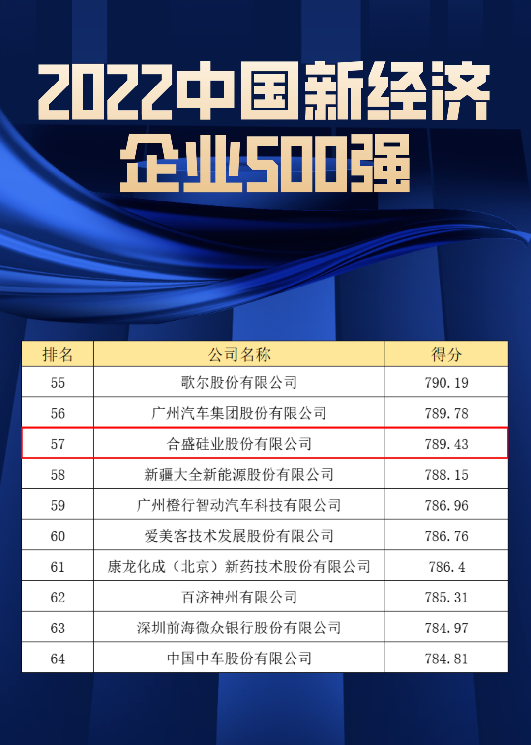 近日,中国企业评价协会正式发布2022中国新经济企业500强榜单,合盛硅业股份有限公司排名第57位,较去年迅速攀升194位。