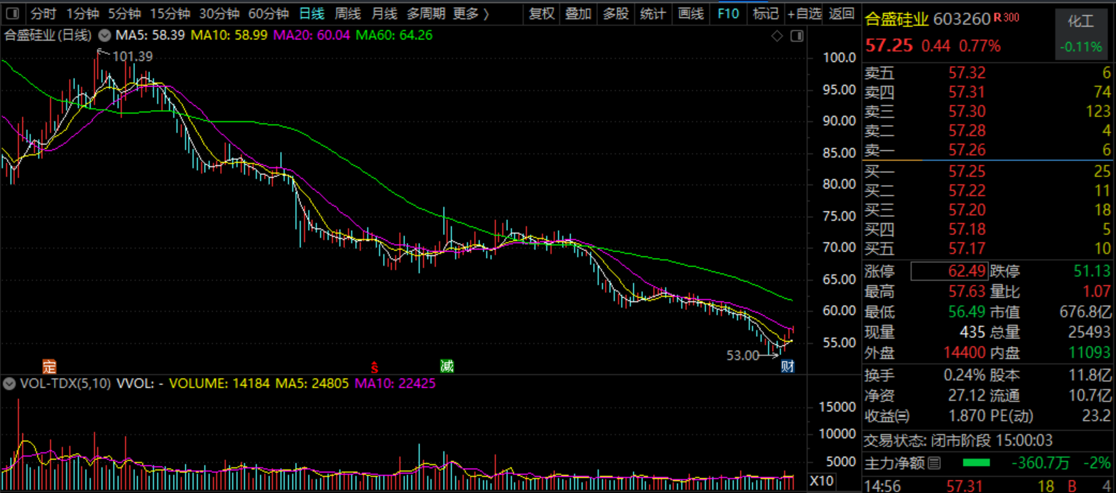截至10月31日收盘,合盛硅业的股价以上涨0.77%报收57.25元,市值约677亿元,较年内最高点蒸发约500亿元。