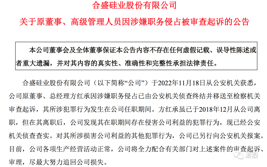2022年11月21日晚间,合盛硅业公告,公司于11月18日从公安机关获悉,公司原董事、总经理方红承因涉嫌职务侵占,已由公安机关侦查终结并移送至检察机关审查起诉,其所涉犯罪行为发生在公司任职期间。
