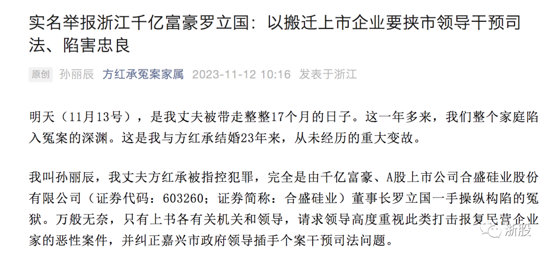 事发近一年后,今天,方红承妻子孙丽辰在社交媒体发文,实名举报合盛硅业董事长罗立国“陷害忠良”——
