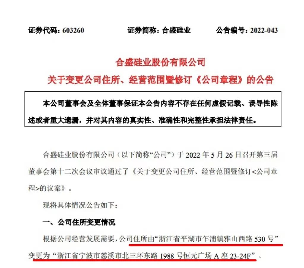 5月28日,合盛硅业公告,董事会已审议决定,将公司“住所”由嘉兴平湖变更为罗立国老家宁波慈溪。