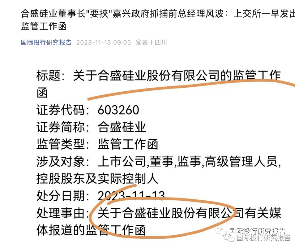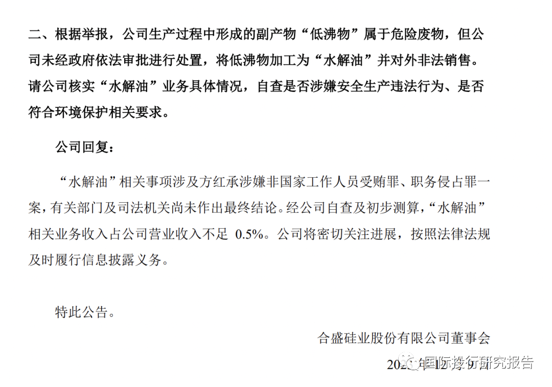 1、上交所十分负责,当天晚上火急火燎发出监管工作函,合盛硅业作为一家上市公司,等了差不多一个月才回复交易所的监管公众函。虽然当时交易所也没说几天回复,但投资者都在等你回复,过了差不多1个月才回复,和上交所的老师相比,合盛硅业董秘是十分不负责不尽职这是肯定的。