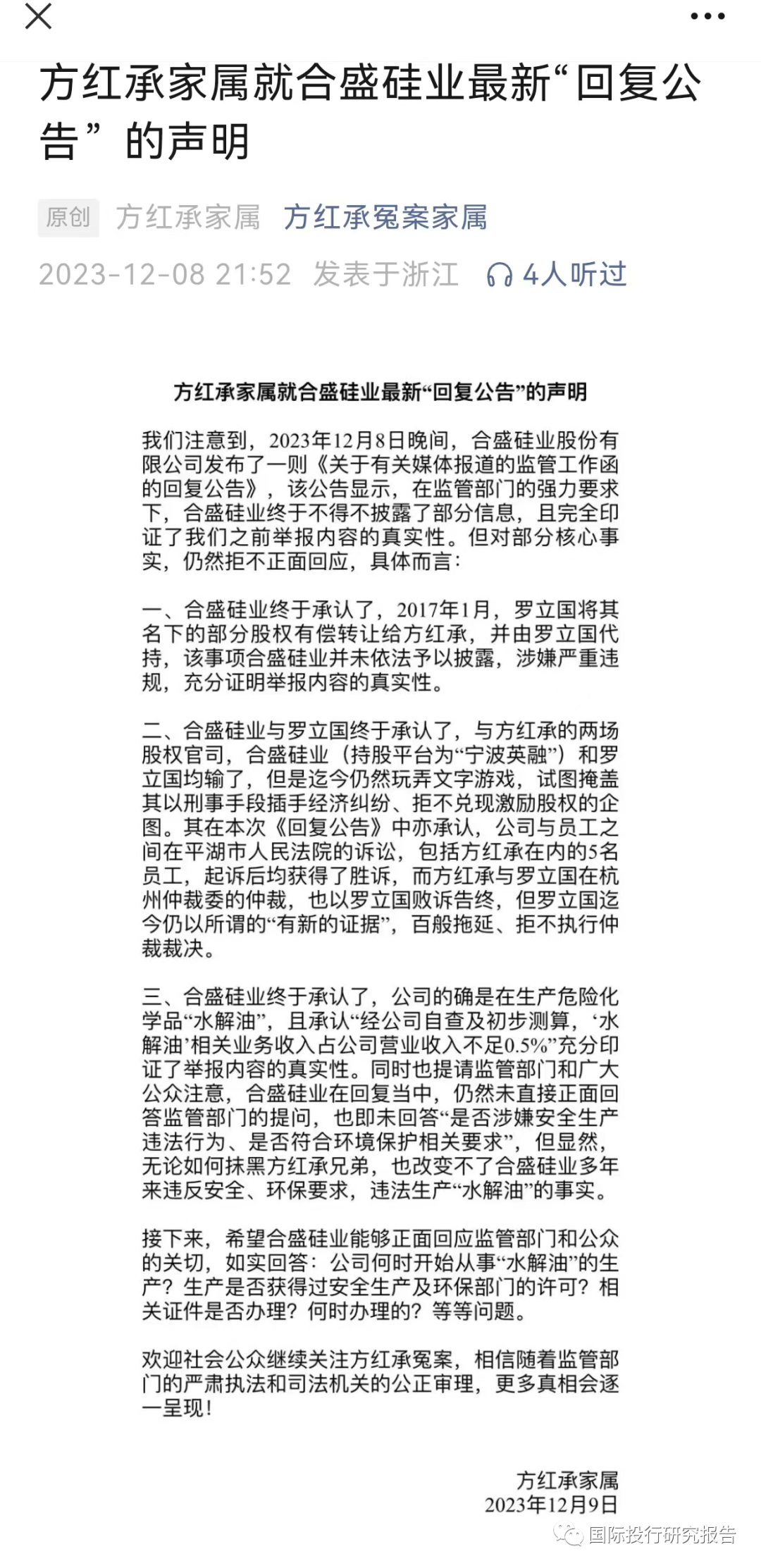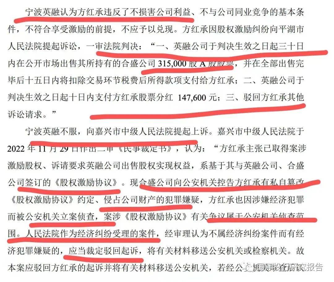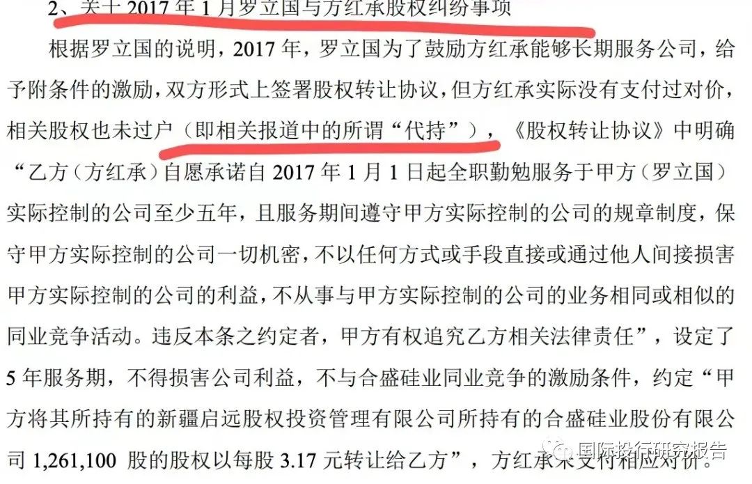 5、具体到方和罗的纠纷,根据合盛硅业公告的描述,第一是公司现在承认2015年曾经签订了股权激励协议,但并没有在IPO说明书中做信息披露(这是后来纠纷的最大原因)。第二是最早平湖法院是判方赢,然后在杭州的仲裁是判方部分赢。然后在嘉兴法院,法院认为公司举报方或有刑事问题,所以推翻了平湖法院的判决。这和当时方举报合盛硅业“要挟”嘉兴市政府的内容有一定的信息合拍。而现在就是要看刑事是否成立,不过从公开信息看,上次开庭未成后这个还是未开庭,所以最后的结果还是要等。