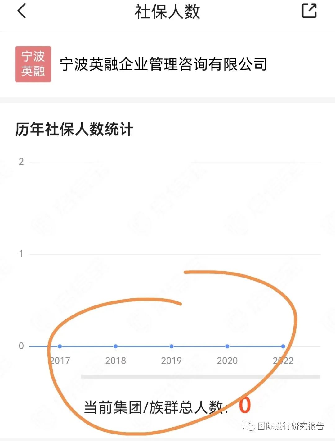 4、宁波英融在IPO的时候还叫新疆启恒股权投资管理有限公司,但经过多年的迁移,从浙江到山东临沂,又到宁波慈溪,最后变成一个主业为“企业管理咨询”的公司,社保缴纳一直都是0,其中是否存在避税的情况需要税务局查一下(同花顺被的持股公司凯士奥被通知补税25亿元的案例例查一查)。