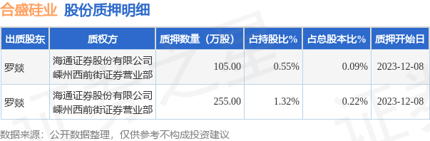 合盛硅业(603260)12月12日公开信息显示,股东罗燚向海通证券股份有限公司嵊州西前街证券营业部合计质押360.0万股,占总股本0.31%。质押详情见下表: