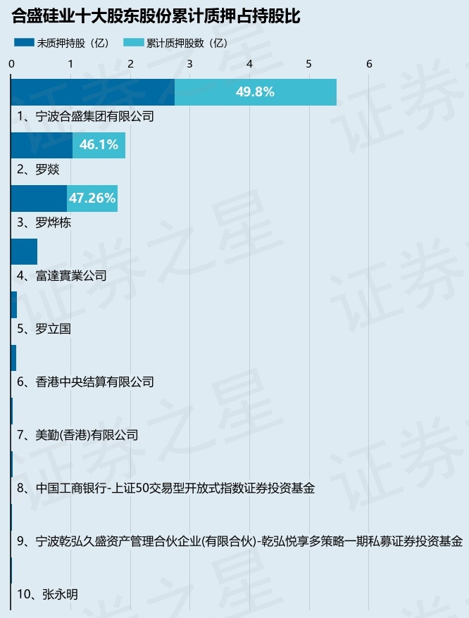 截止本公告日,股东宁波合盛集团有限公司已累计质押股份2.72亿股,占其持股总数的49.8%,股东罗燚已累计质押股份8873.57万股,占其持股总数的46.1%,股东罗烨栋已累计质押股份8479.0万股,占其持股总数的47.26%。本次质押后合盛硅业十大股东的累计质押股份占持股比例见下图: