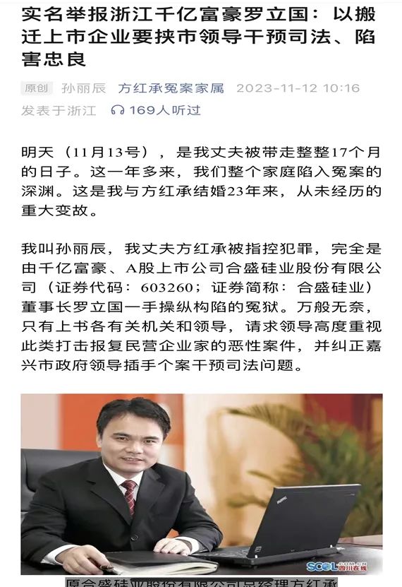 11月12日,合盛硅业原总经理方红承家属在微信公号中发布一篇《实名举报浙江千亿富豪罗立国:以搬迁上市企业要挟市领导干预司法、陷害忠良》的文章,公开了合盛硅业董事长罗立国与原总经理方红承之间的纠纷拉锯细节。