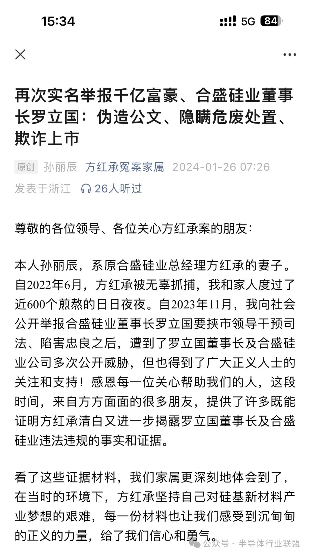 1月26日上午,原合盛硅业总经理方红承妻子孙丽辰,通过微信公众号“方红承冤案家属”再次发文:《再次实名举报千亿富豪、合盛硅业董事长罗立国:伪造公文、隐瞒危废处置、欺诈上市》。孙丽辰称:“我们根据近期掌握了解的大量情况,暂时仅披露一部分与方红承案件有关的事实,向有关部门和社会公开举报。”