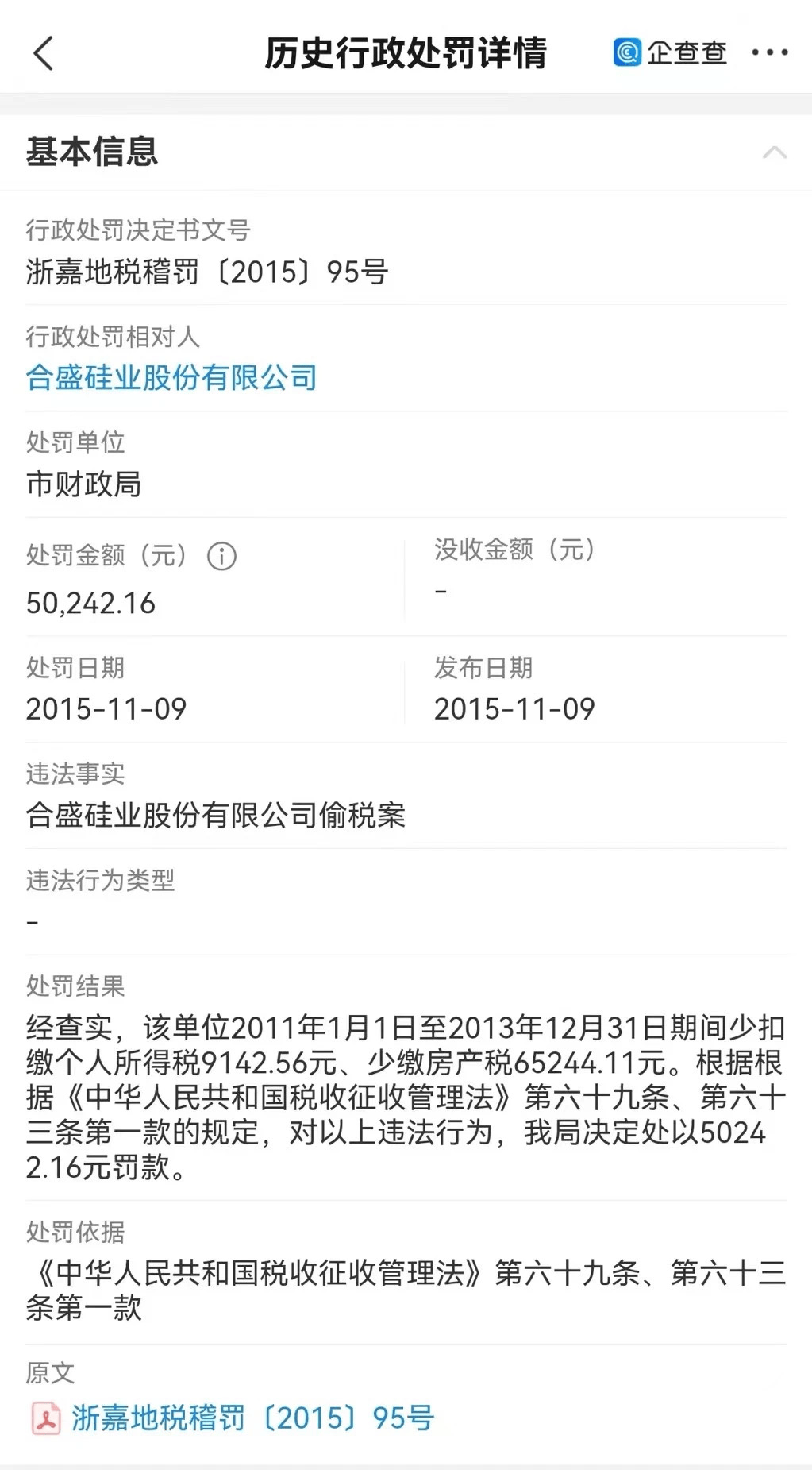 其中,“在2017年上市前夕涉嫌伪造行政机关公文骗取上市”较为关键,方红承家属在公众号中表示,2011年1月1日—2013年12月31日期间,合盛硅业少扣缴个人所得税约9142.56元、少缴房产税约6.52万元。对此,2015年11月9日,嘉兴市地方税务局第三税务分局作出《税务行政处罚决定书》(浙嘉地税稽罚[2015]95号),对合盛硅业处以罚款约5.02万元。