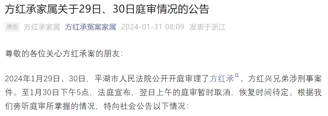 “1月30日上午,在发现参与违法审讯的侦查人员全程旁听案件等严重违法问题后,又鉴于本案从立案到审判全流程的人为干预司法、操纵案件的情况迟迟未能解决,方红承对平湖市人民法院能否继续公正审理本案产生了强烈的质疑,并拒绝继续配合法院的违法审理,要求休庭、将案件移送嘉兴以外的法院审理,本案因此休庭,再度开庭时间尚无通知。”方红承家属在公众号中表示,至1月30日下午5点,法庭宣布,翌日上午的庭审暂时取消,恢复时间待定。