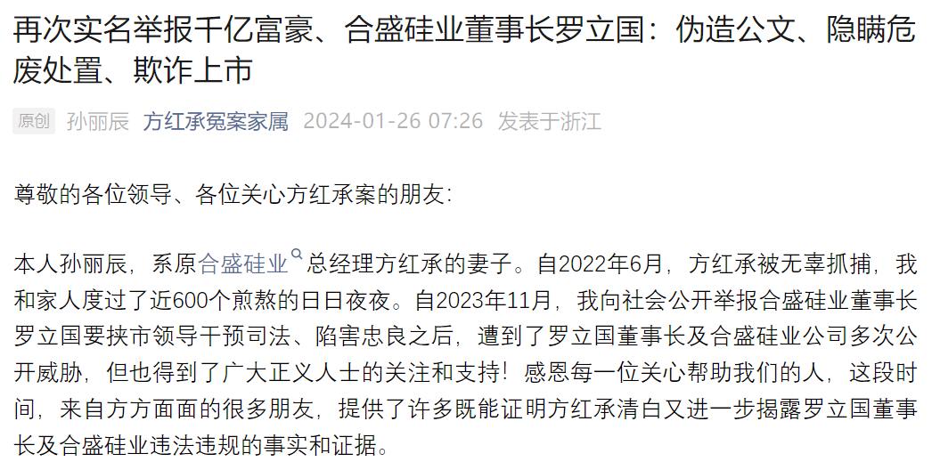 就在方红承兄弟案件开庭审理之前,其家属1月26日在公众号上发布了“再次实名举报千亿富豪、合盛硅业董事长罗立国:伪造公文、隐瞒危废处置、欺诈上市”的文章。