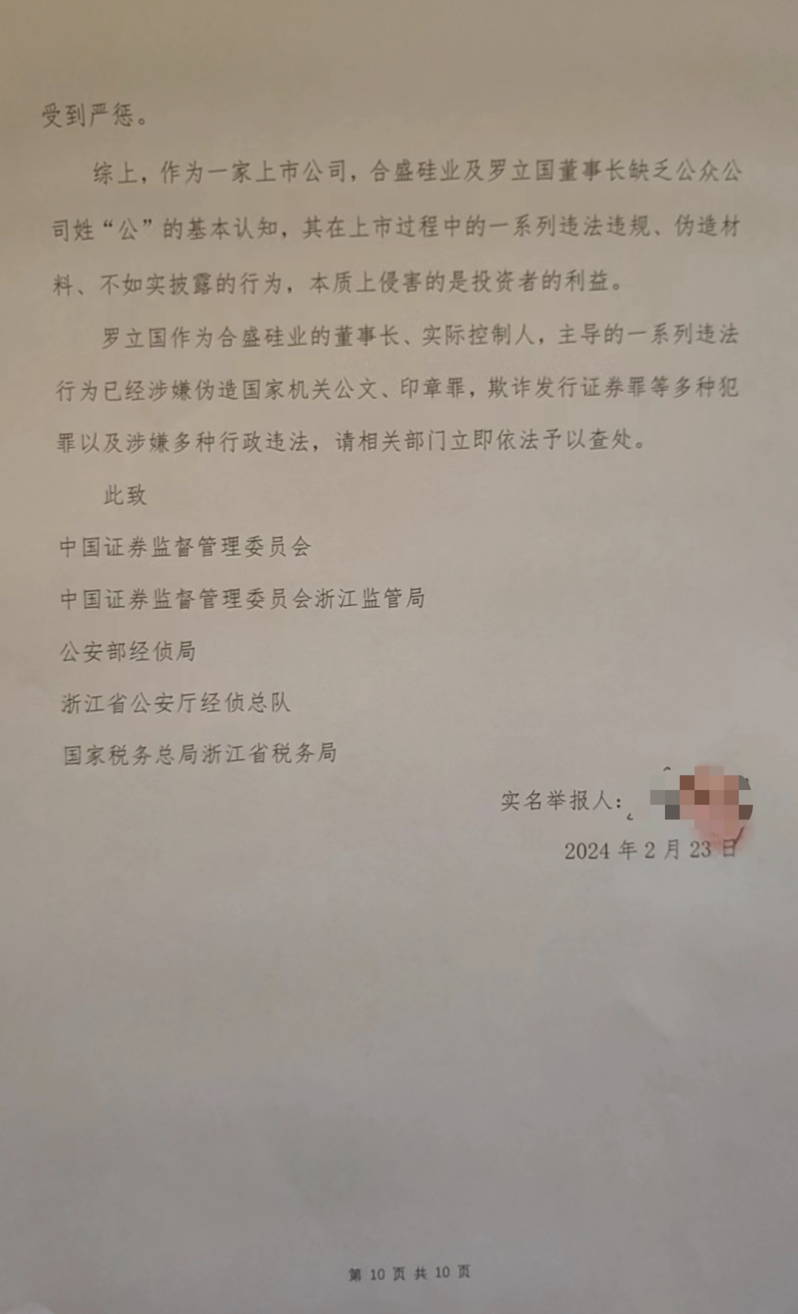 此外,记者从方红承亲属处了解到,2月23日,方红承亲属已就“合盛硅业在2017年上市前夕涉嫌伪造国家性质机关公文、印章骗取上市”等问题形成相关举报材料并寄往证监会、浙江证监局、国家税务总局浙江省税务局等部门。