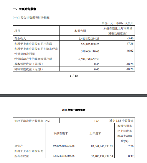 此前,在2024年04月30日,合盛硅业(603260.SH)发布了2024年一季度业绩报告。公司实现营业收入54.16亿元,同比下降5.46%,归母净利润为5.28亿元,同比下降47.36%,实现经营活动产生的现金流量净额-25.94亿元,同比持续恶化,资产负债率为63.77%,同比上升11.99%。