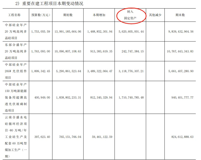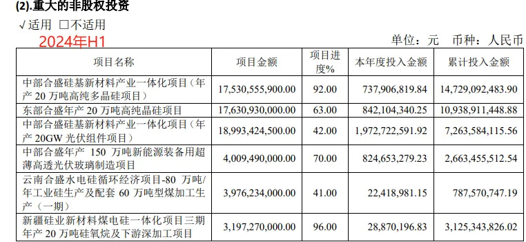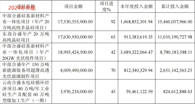 公司在2024年合计在建工程转固总额为137亿,但仍存在总额为361亿的在建工程未转固,而2024年下半年实际投入已经相当少。而多晶硅项目则存在200亿以上的在建工程总量。而中部合盛的完工率已高达92%,投入资金已高达96%!