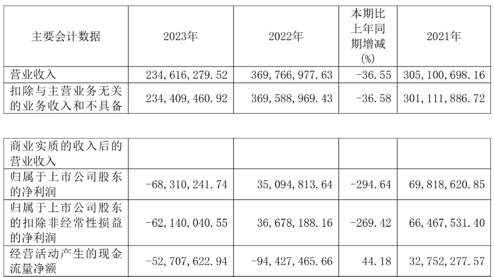 2023年,立航科技实现营业收入2.35亿元,同比下降36.55%;归属于上市公司股东的净利润为-6831.02万元,上年同期盈利3509.48万元;归属于上市公司股东的扣非净利润-6214.00万元,上年同期盈利3667.82万元;经营活动产生的现金流量净额为-5270.76万元,上年同期为-9442.75万元。