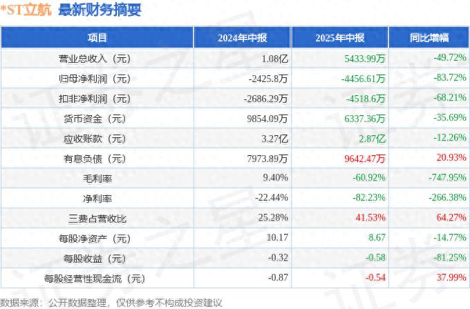 近期*ST立航(603261)发布2025年中报。截至本报告期末,公司营业总收入5433.99万元,同比下降49.72%,归母净利润-4456.61万元,同比下降83.72%。按单季度数据看,第二季度营业总收入1056.77万元,同比下降88.95%,第二季度归母净利润-3963.67万元,同比下降183.45%。本报告期*ST立航三费占比上升明显,财务费用、销售费用和管理费用总和占总营收同比增幅达64.27%。