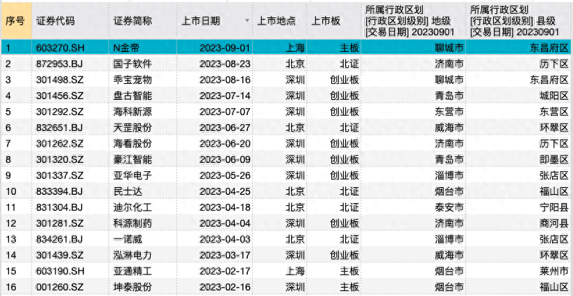 9月1日,金帝股份(603270.SH)正式登陆上交所,发行价格21.77元/股,市盈率为41.68倍。上市首日,金帝股份高开高走,以39.90元/股价格开盘,盘中涨超94%。经济导报记者注意到,这是2023年内山东第16家A股上市公司,也是聊城市年内上市的第2只鲁股(A股)。