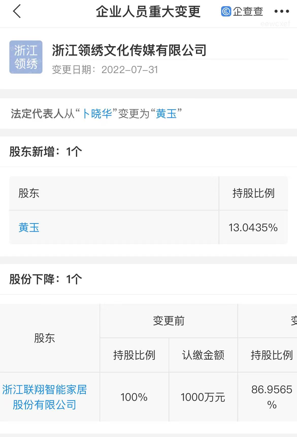 8月1日,据查询,浙江联翔智能家居股份有限公司(以下简称“联翔股份”)转让浙江领绣文化传媒有限公司(以下简称“领绣文化”)13.04%股权,黄玉接盘。