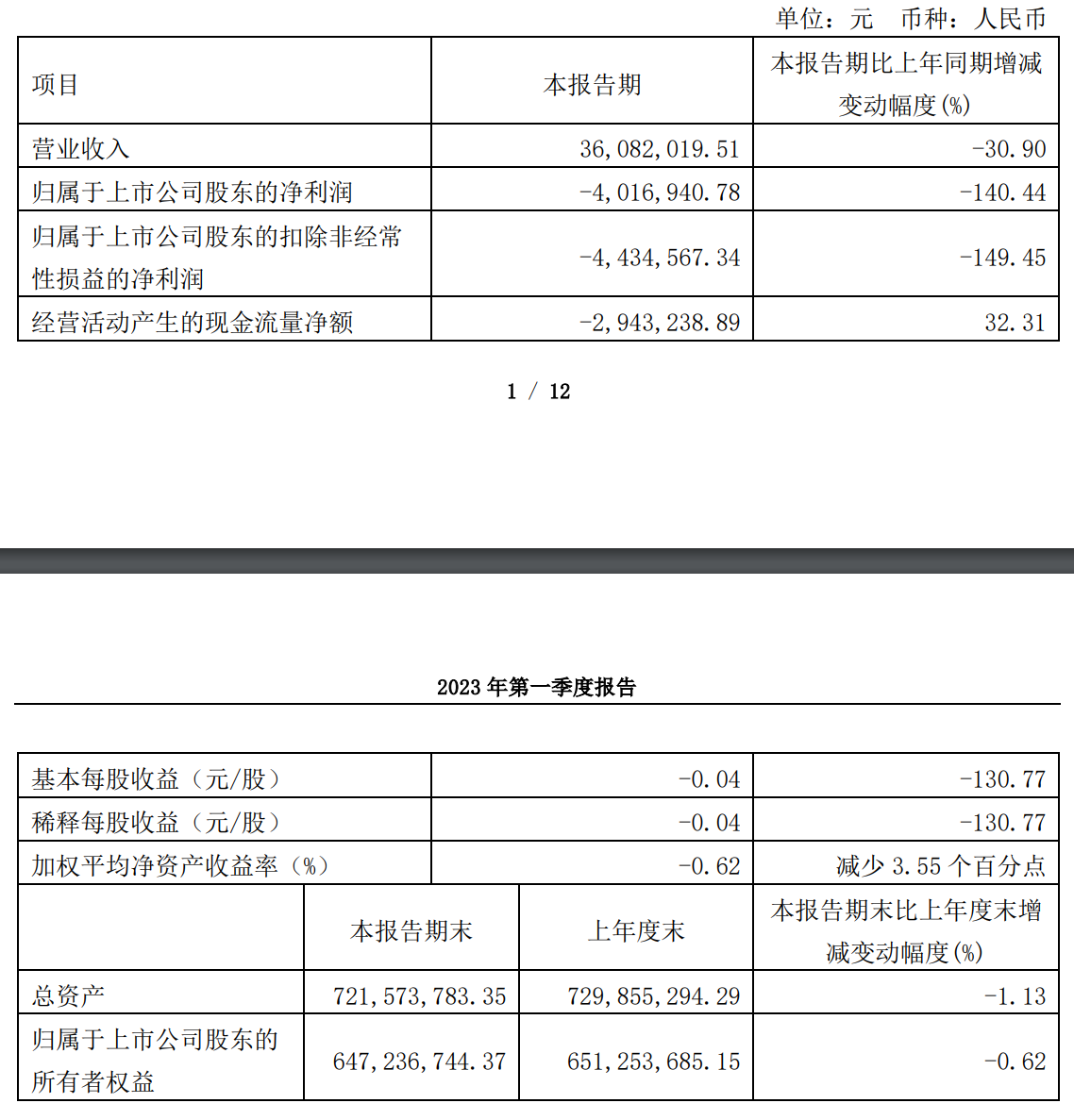 公告显示,2023年第一季度联翔股份营业收入3608.2万元,同比减少30.9%;归属于上市公司股东的净利润为-401.69万元,同比减少140.44%。