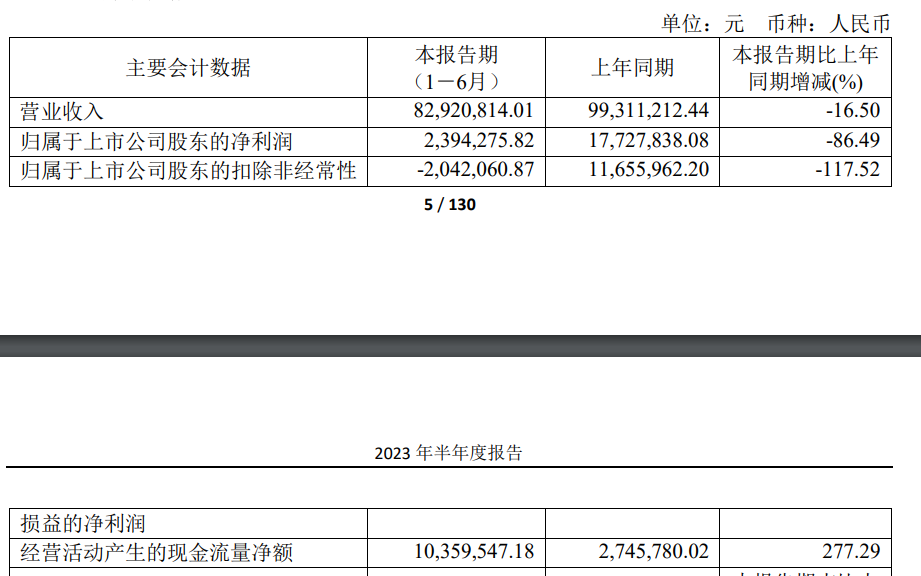 报告期内,联翔股份营业收入8292.08万元,同比降16.5%;归属于上市公司股东的净利润239.43万元,同比降86.49%;归属于上市公司股东的扣除非经常性损益的净利润-204.2万元。
